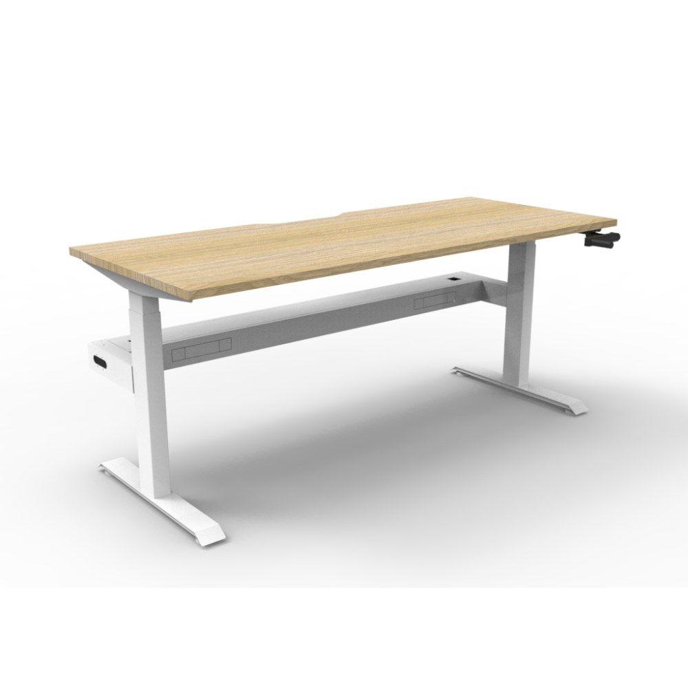 • Rapidline Boost single sided manual crank height adjustable workstation with cable tray. Natural oak top with white frame.