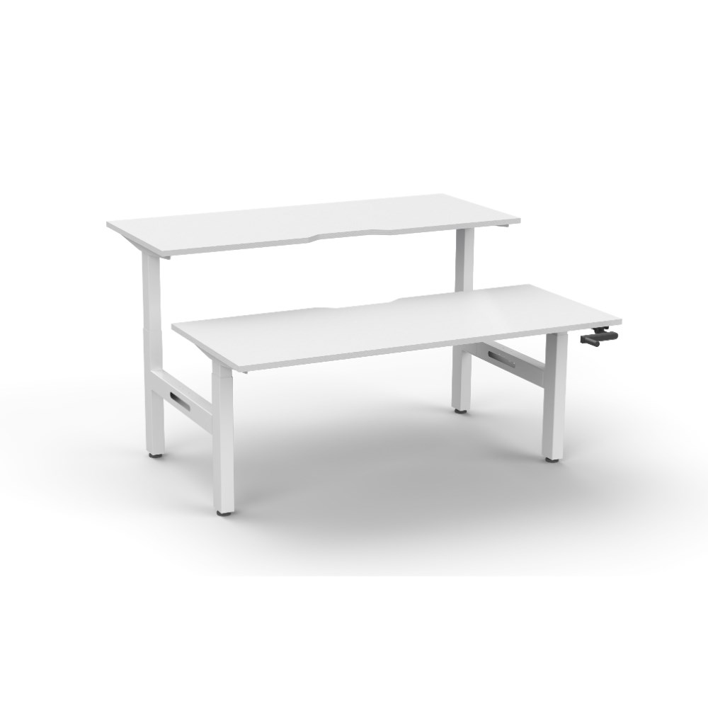 • Rapidline Boost back to back 2 person manual crank height adjustable workstation. White top with white frame.