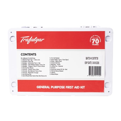 • Contents: 50 x Adhesive First Aid Strips, 1 x Adhesive Paper Tape 1.25cm x 5m, 1 x Antiseptic Cream 25g, 1 x Bandage Conforming 7.5cm x 1.8m and 1 x Bandage Crepe Medium Support 7.5cm x 2m.