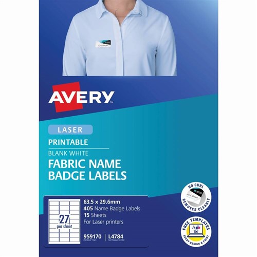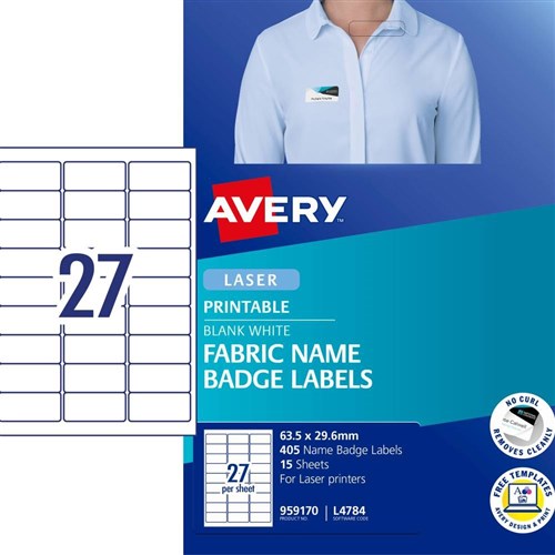 Avery Fabric Name Badge Laser Labels White L4784 63.5x29.6mm 27UP 405 Labels 15 Sheets