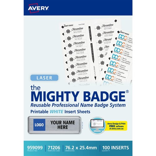Avery Mighty Badge Printable Inserts Laser White 71206 76.2 x 25.4 mm 20UP 100 Inserts