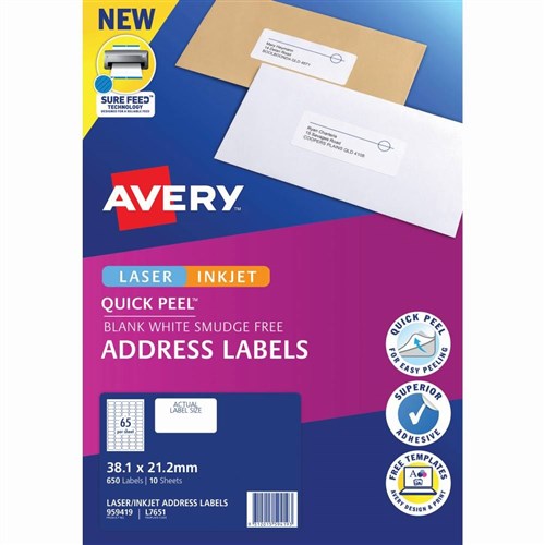Avery Quick Peel Address Laser & Inkjet Labels White L7651 38.1 x 21mm 140 Labels