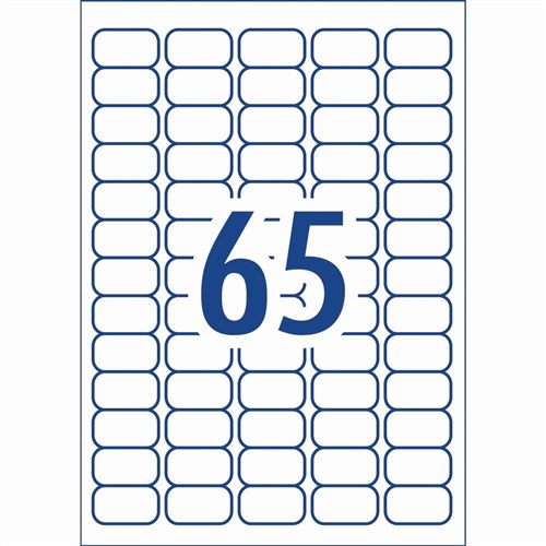 • Size: 38.1x21.2mm 650 labels, 10 Sheets. 65 labels per sheet (65UP).