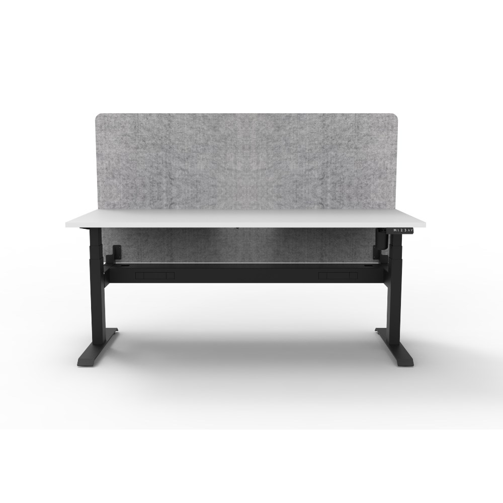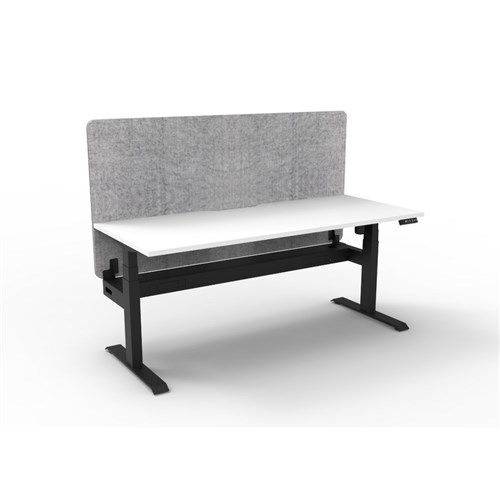 • Electric height adjustable single sided workstation with Natural White top and Black Satin frame, Grey Eco screen and cable tray.