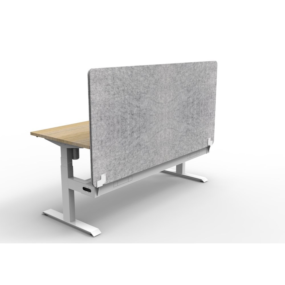 • Electric height adjustable single sided workstation with Natural Oak top and White Satin frame, Grey Eco screen and cable tray.