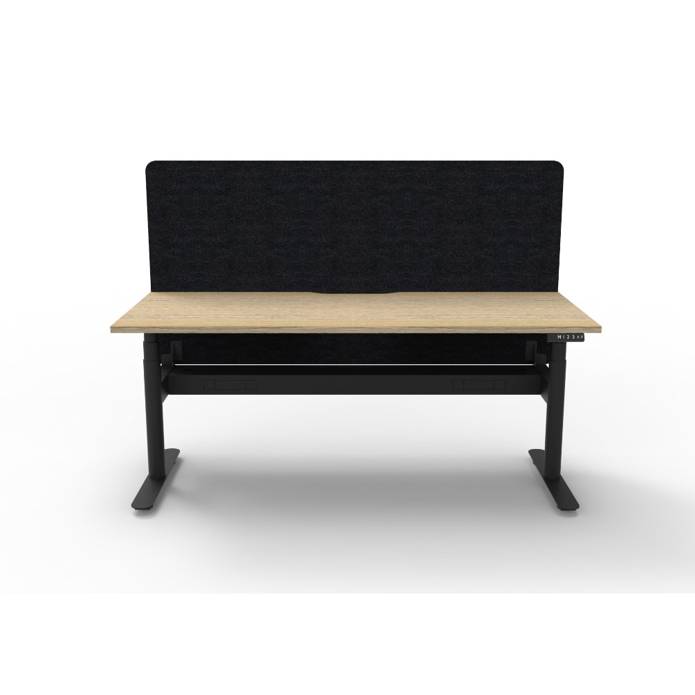 • Natural Oak worksurface with rigid edging and 50mm scallop cable cut out. E0 rated 25mm top. Black Satin powder coat round-leg frame. Eco screen and cable tray.