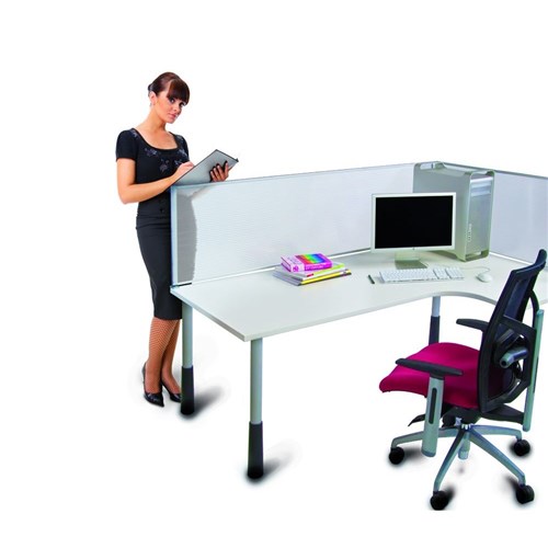 • A desk mounted divider which is fully framed in aluminium providing a lightweight yet strong frame that can support the panels without being overly bulky or heavy.