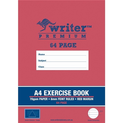 • Writer Premium Exercise Books feature heavy duty covers, high quality white 70gsm paper with blue ruled lines and a red margin